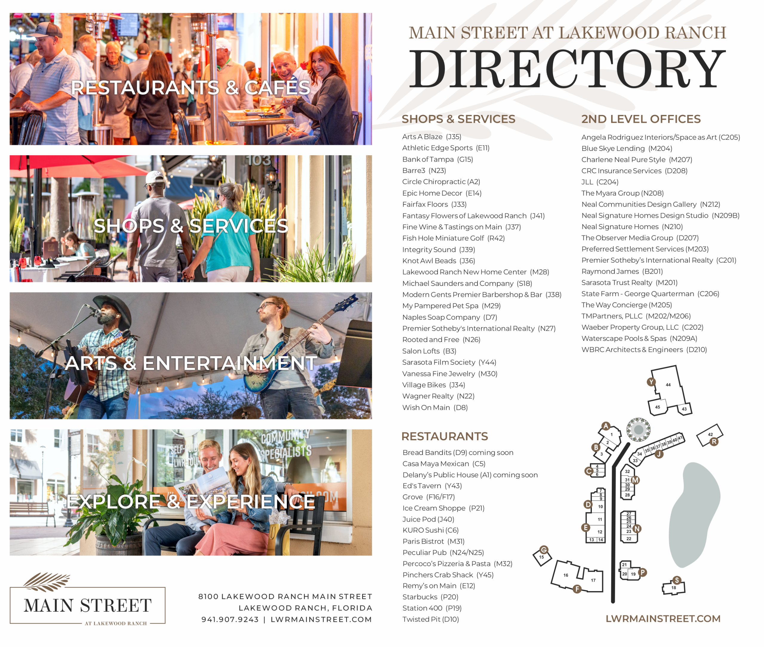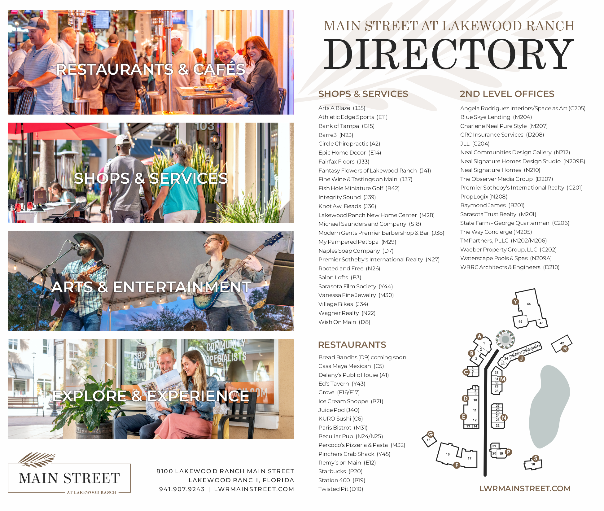 Welcome to Main Street at Lakewood Ranch! A picturesque town center lined with cafes and boutiques, specialty shops, international restaurants, the cinema, and various services and businesses. The open air, pedestrian-friendly environment provides a unique place for strolling and shopping, special events, and concerts and festivals all year long. Come out and experience Main Street today!