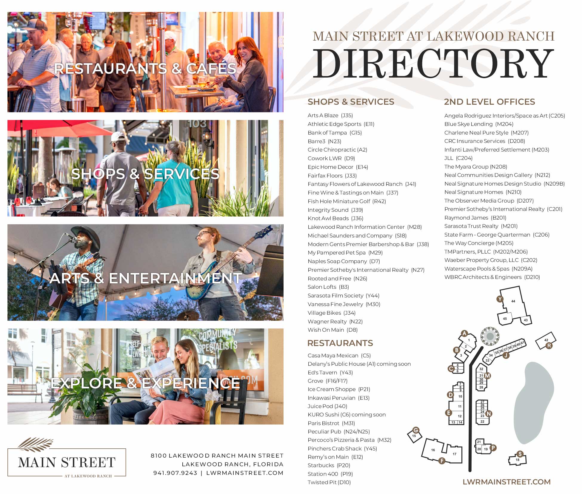 Welcome to Main Street at Lakewood Ranch! A picturesque town center lined with cafes and boutiques, specialty shops, international restaurants, the cinema, and various services and businesses. The open air, pedestrian-friendly environment provides a unique place for strolling and shopping, special events, and concerts and festivals all year long. Come out and experience Main Street today!